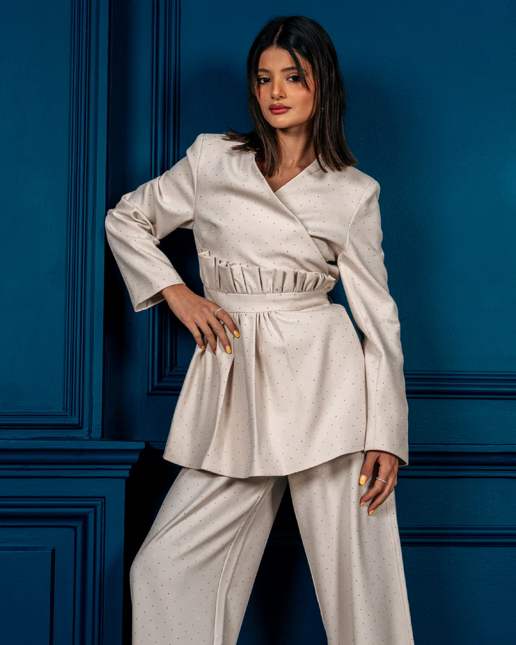 بدله كامله بلون بيج مزينة بلمعة كريستال أنيقة. تتكون من بليزر ربيعي مع بنطلون مريح ، تصميم حصري بقطع محدودة .